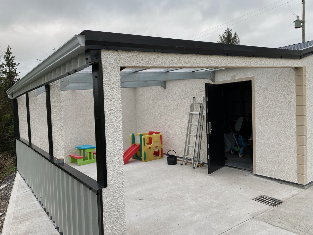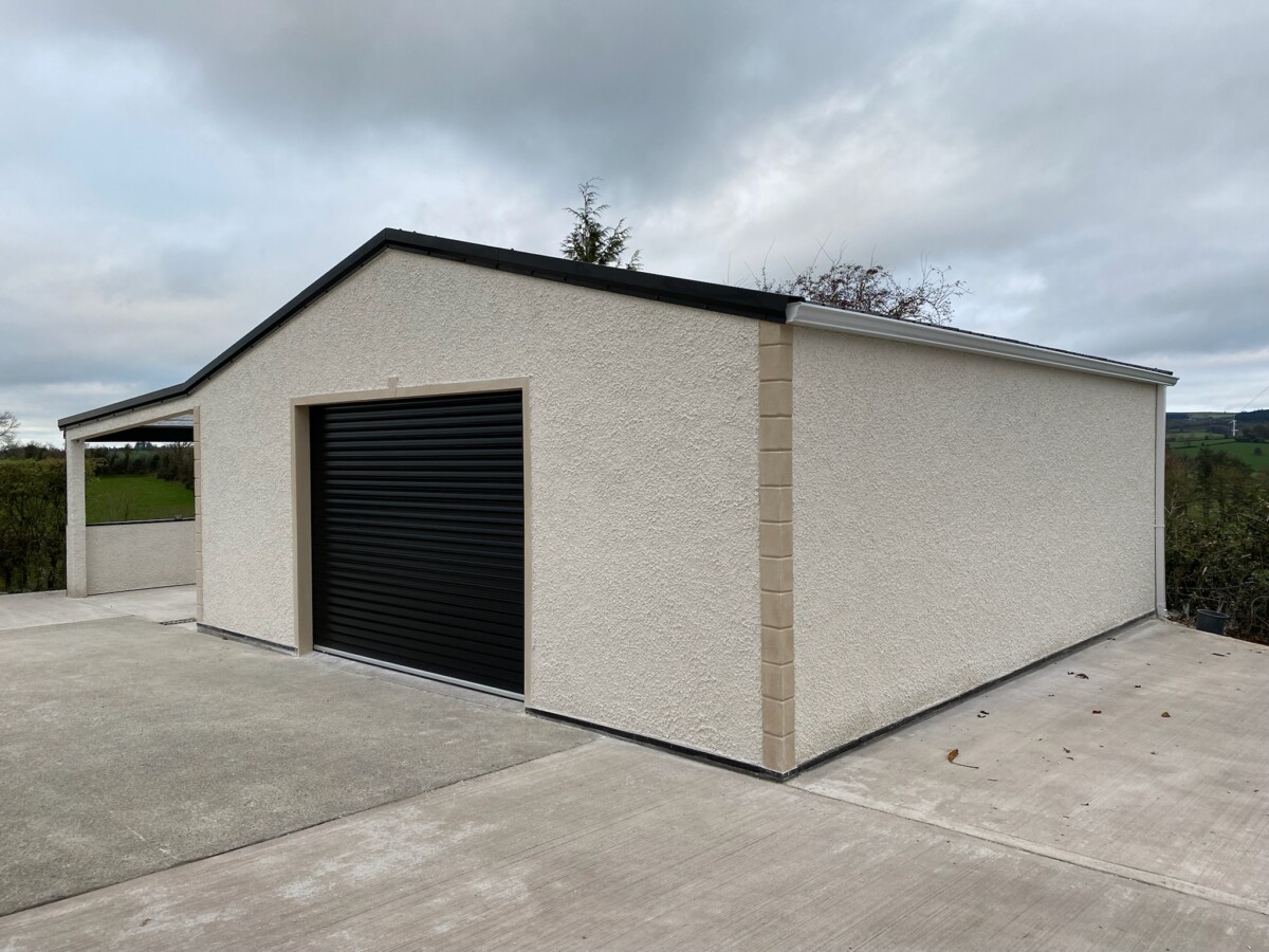 Fully galvanised steel building recently completed in a rendered finish. Lean-to added to one side for extra storage. For all enquires please fill in our enquiry form here.
